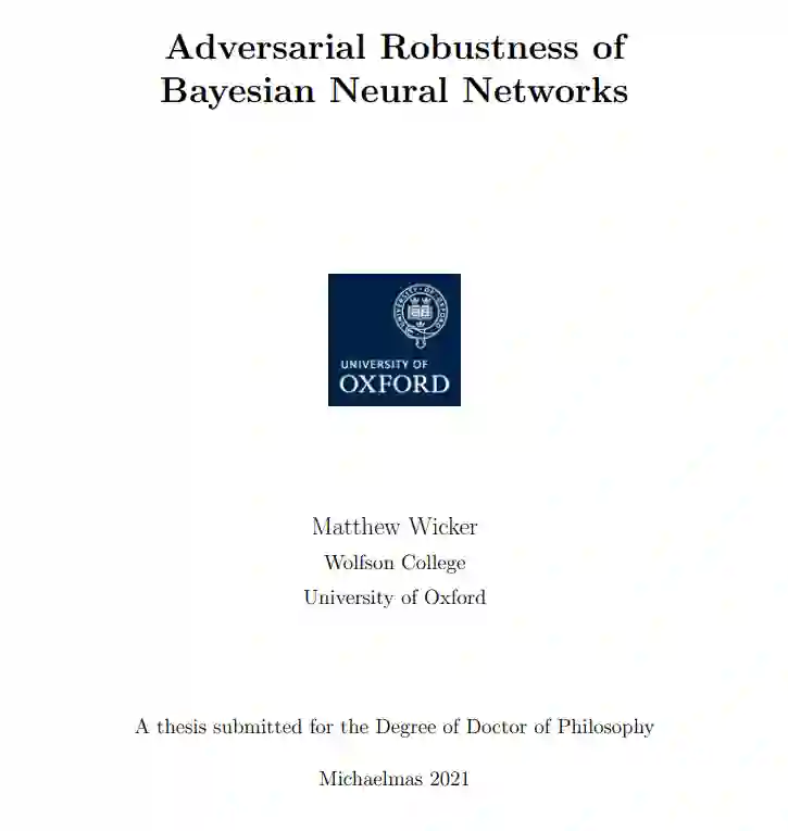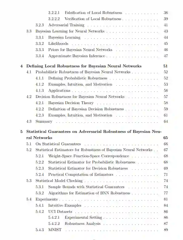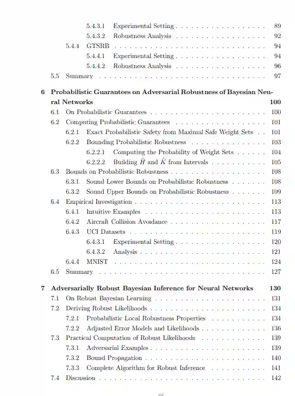 尽管贝叶斯神经网络有许多吸引人的特性,但无法用确定性神经网络开发的技术直接分析贝叶斯神经网络[168]。贝叶斯网络与确定性网络的主要区别在于前者的参数值具有后验分布。为了验证这种模型的鲁棒性,必须找到一种方法来执行确定性神经网络可用的正确性分析,同时以合理的方式考虑到范围或可能的参数值。这样做是在安全关键场景中安全部署贝叶斯神经网络的必要前提。在这篇论文中,我们开发了一些工具,允许我们在贝叶斯环境下利用确定性神经网络的鲁棒性量化方面的进展。特别地,我们研究了贝叶斯神经网络鲁棒性的两个概念,这允许从业者在给定贝叶斯神经网络部署之前量化其最坏情况的行为。贝叶斯神经网络鲁棒性的第一个概念是概率鲁棒性(在第4章中定义)。这允许从业者理解模型固有的随机性及其对抗鲁棒性之间的相互作用,也可以被视为不确定性的最坏情况度量。鲁棒性的第二个概念是贝叶斯决策鲁棒性。贝叶斯神经网络除了在其权重上有一个分布之外,还与确定性神经网络不同,因为我们必须对其预测分布和错误决策的风险或损失进行推理,以便做出预测。决策鲁棒性考虑了考虑中的贝叶斯模型的决策过程,并允许我们证明即使在对手存在的情况下,也会发布正确的决策。这些定义允许我们量化贝叶斯神经网络的概率正确性。