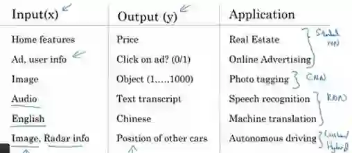 在监督学习中,输入x会习得一个函数,它映射到输出y。比如我们之前看到的,应用于房价预测的例子。输入房屋的一些特征,就能输出或者预测价格y。下面是一些其它例子,这些例子中神经网络效果拔群。