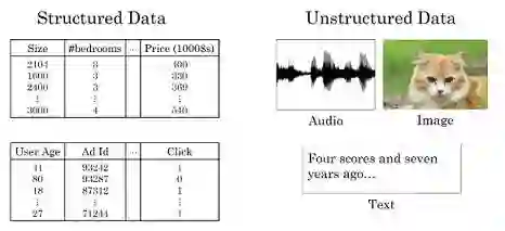 你可能也听说过,机器学习被应用于结构化数据和非结构化数据,下面是这些术语的含义。结构化数据,是数据的数据库,例如在房价预测中,你可能有一个数据库或者数据列,告诉你房间的大小和卧室数量,这就是结构化数据。在预测用户是否会点击广告的例子中,你可能会有用户信息比如年龄,还有广告信息,还有你要预测的标签y,这就是结构化数据,意味着每个特征,比如说房屋大小、卧房数量、用户的年龄,都有着清晰的定义。