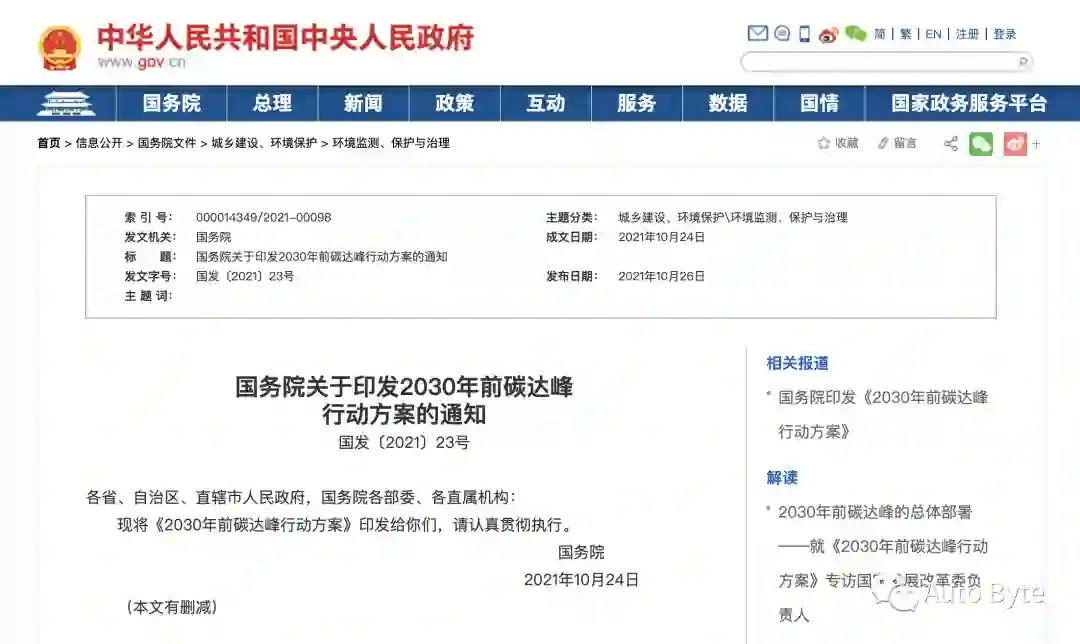 近日,国务院发布了关于印发2030年前碳达峰行动方案的通知(以下简称《通知》),指出到2030年时,单位国内生产总值二氧化碳排放比2005年下降65%以上,从而实现碳达峰目标。