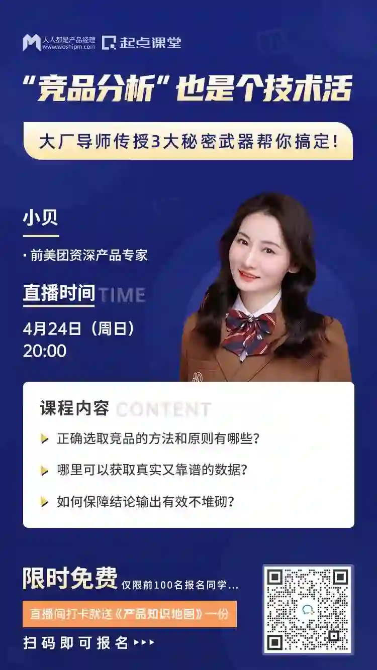 别慌!我特地为你准备了直播福利课,针对产品新人解决在竞品分析中存在的信息获取难、功能拆解难以及数据分析难等具体问题,帮助你避开竞品分析中的误区,做有价值的竞品分析,为你的面试求职助力!