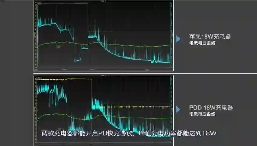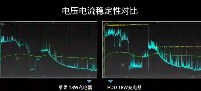 另外,值得说的是,苹果充电器在充电过程中,电压和电流稳如老狗,而 PDD 充电器的电压和电流明显波动很大,这说明滤波和稳压电路很差。