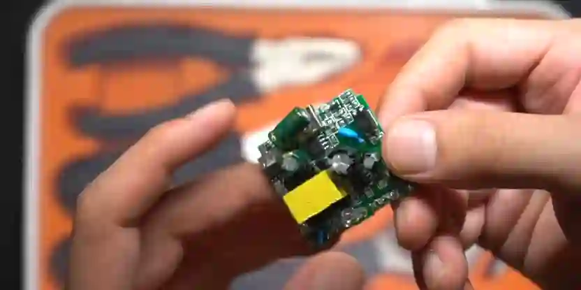 PDD 充电头是一体化设计,无从下手,只能暴力打开,掀开顶部的塑料盖,看到了内部的结,构抽拉出绿色的主板,主板的正面焊接着各种原件,放大看一下,变压器和几个电容,零星几个黑色芯片。