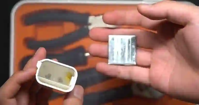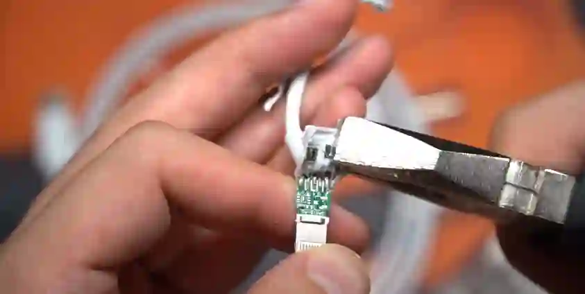 接着看 Lighting 端子,这是 MFi 认证的核心,直接钳子捏碎塑料外壳,看到端子被灌胶包裹,而苹果的线缆,使用的钢套保护,激光点焊固定,是用钳子暴力撕开灌胶塑料,漏出绿色的 PCB 小板。可能由于过于暴力,内部的芯片已经脱焊,粘在灌胶塑料上,使用的破解的芯片。USB-C口的做工也很比较粗制滥造,和苹果原装线缆相差甚远。