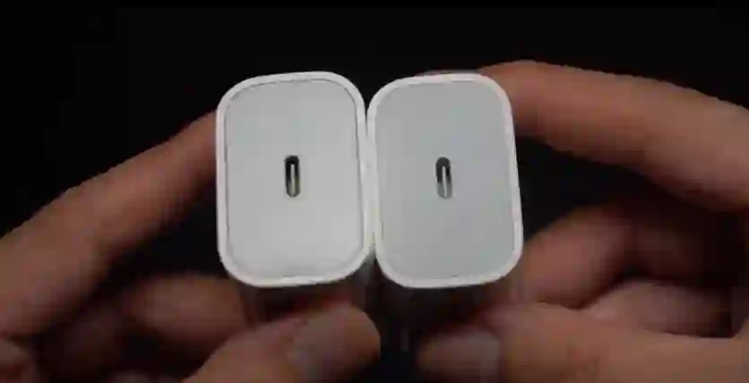 两天后我收到这么个玩意,一个小巧的瓦楞纸盒,内部是两个自封袋,袋子内部分别是充电器和充电线缆。PDD 这款充电器的造型和苹果的 18W 充电器一模一样,在底部铭文,也能看出,这就是把苹果 logo 去掉,改成了 PD 18W 快充。机身材质和做工、和苹果原装有差距,在机身缝隙、USB C 接口和舌片、还有充电插脚,都可以看出二者差距,毕竟苹果的超声波焊接和激光镭射不是谁都仿造的出来。