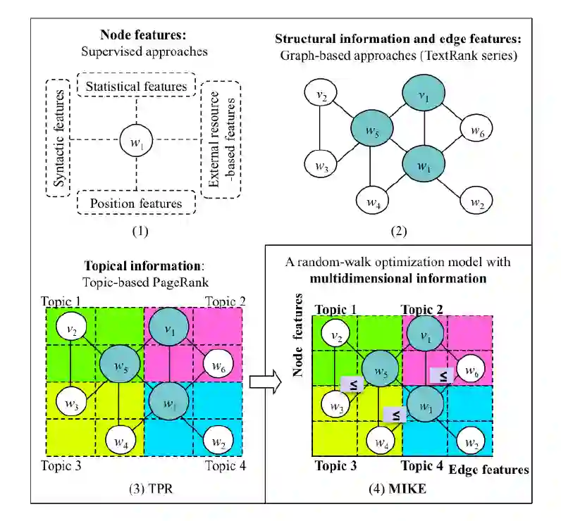 传统的监督式关键短语提取模型取决于标记的短语的特征,而流行的非监督式模型主要依赖于词图的结构,候选词作为节点,边捕获词之间的共现信息。然而,将所有这些多维异构信息系统地集成到一个统一的模型中是相对未曾探索过的。在本文中,专注于如何有效地利用多维信息来提高关键短语提取性能(MIKE),其中包括词共现,文档主题分布,Word2Vec。与现有的基于图的关键短语提取算法相比,MIKE充分利用了候选词之间的共现性、候选词的特征和候选词的主题特征,通过大幅度修改转换概率矩阵和重置底层词图概率向量,优化随机游走模型。这使得词图随机游走过程语义更丰富。(公式一为利用共现优化边特征,最终对转换概率进行修改;公式2为利用主题,词特征优化点特征,最终对重置概率进行修改)