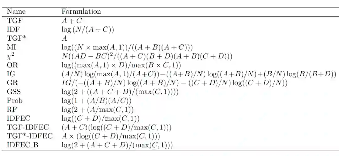 其中,互信息(MI),卡方,信息增益(IG),增益比(GR)原理相同,即每个类别下信息越丰富的术语,在该类正例和负例中分布也较多。而逆类频率因子(ICF),IDF变体—逆文档频率类别排除因子(IDFEC)则不仅限于区分,还加入不同的惩罚机制,使同类正负样本区别更大。基于概率的Prob算法将权重分为两类:描述能力和区分能力,如果该术语出现在许多类别的文档中,则描述能力比率会增加,而如果该术语仅出现在该类别的文档中,则区分能力比率会增加。关联频率因子(RF)因子则考虑了跨类的术语分布,即如果正例中的高频项的集中度高于负例中的高频项的集中度,对分类的贡献越大。