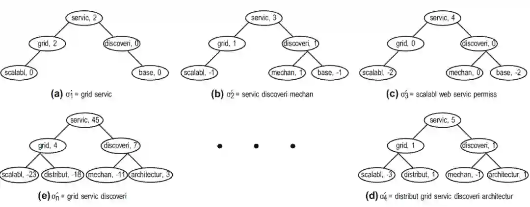 在不同种类的树型数据结构中,KePhEx树属于二叉树。同样,尽管二叉树存在多种变体,但它与其他变体不同,因为树中每个节点的位置和级别都是固定的。同样,与其他变体不同,上层节点(包括根节点)的所有前置节点也都是固定的。之所以如此,是因为一个好的关键词是一个连贯的、连续出现在文本中的单词序列。KePhEx树中的每个节点都包含CI和μ值。CI提供了两个优点: