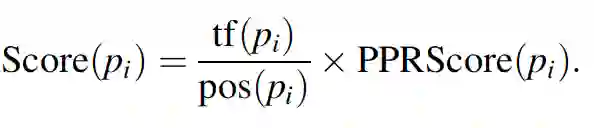 给定一个文档,首先选择候选关键词。然后,基于语义相似度对关键词进行聚类,以覆盖更多的主题。每个簇中的关键项都链接到知识图中的实体。对于每个簇,以映射的实体作为锚节点,通过从知识图谱中提取h-hop键项图来映射输入文档中的键项与键项的关系,将所有聚类对应的所有关键项图合并成一个完整的文档图。对完整的文档图应用个性化的PageRank,得到每个候选关键词的排名得分。候选短语的PPR分数是关键字的PPR分数之和。并将另外两个短语特征(短语频数和第一次出现位置)与短语PPR评分相结合,得到最终的短语得分,并选择排名前K的短语作为关键短语。