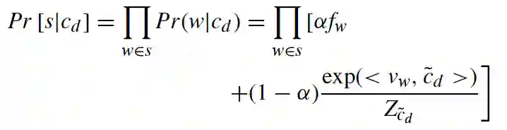 本文选择句子embedding模型SIF来获得名词短语(NP)和文档的embedding,根据SIF理论,对于d文档,s语句的生成是一个动态随机游走过程。第k个单词wk在步骤k生成。假设所有单词的生成都是由单个主题cd决定的。对于给定的句子,句子embedding是主题embedding的最大似然估计,它决定了整个文档。因此,计算候选关键字embedding与文档embedding之间的距离就是计算候选关键字与文档主题之间的相似度。论文中提出了两个“平滑”假设。一个是假设上下文决定有些词是否出现。另一个假设是高频词(停用词)的出现与句子的主题无关。基于这些假设,以cd为主题的s句的生成概率为: