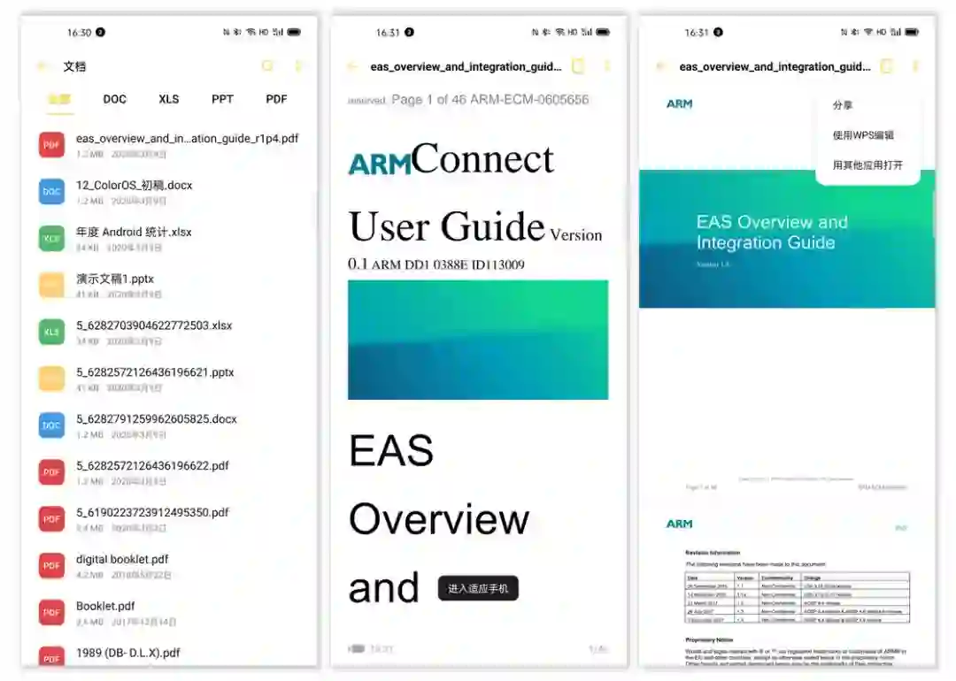 在文件管理器中的文档分类视图下我们可以看到,ColorOS 7.1 现在已经默认支持了 DOC、XLS、PPT 和 PDF 四种文档的直接预览,点击不同格式的文档即可调用对应的文档查看器直接浏览。