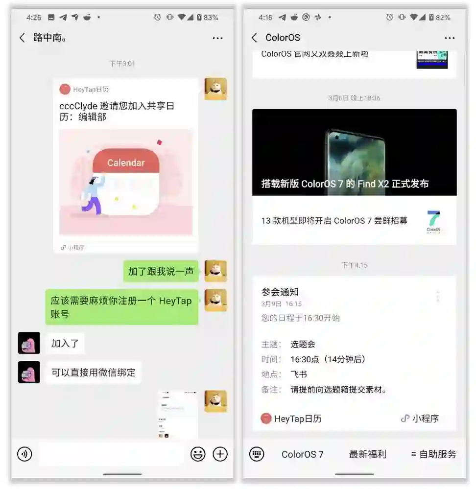 同时,新版日历也通过与微信、系统邮件应用的整合获得了轻量化的日程协同能力:新建日历事项后,我们可以直接通过微信向同事发出日程邀请,被邀请人可通过 HeyTap 日历小程序加入到日程事件当中,同时通过微信收到日程相关的邀约和提醒。