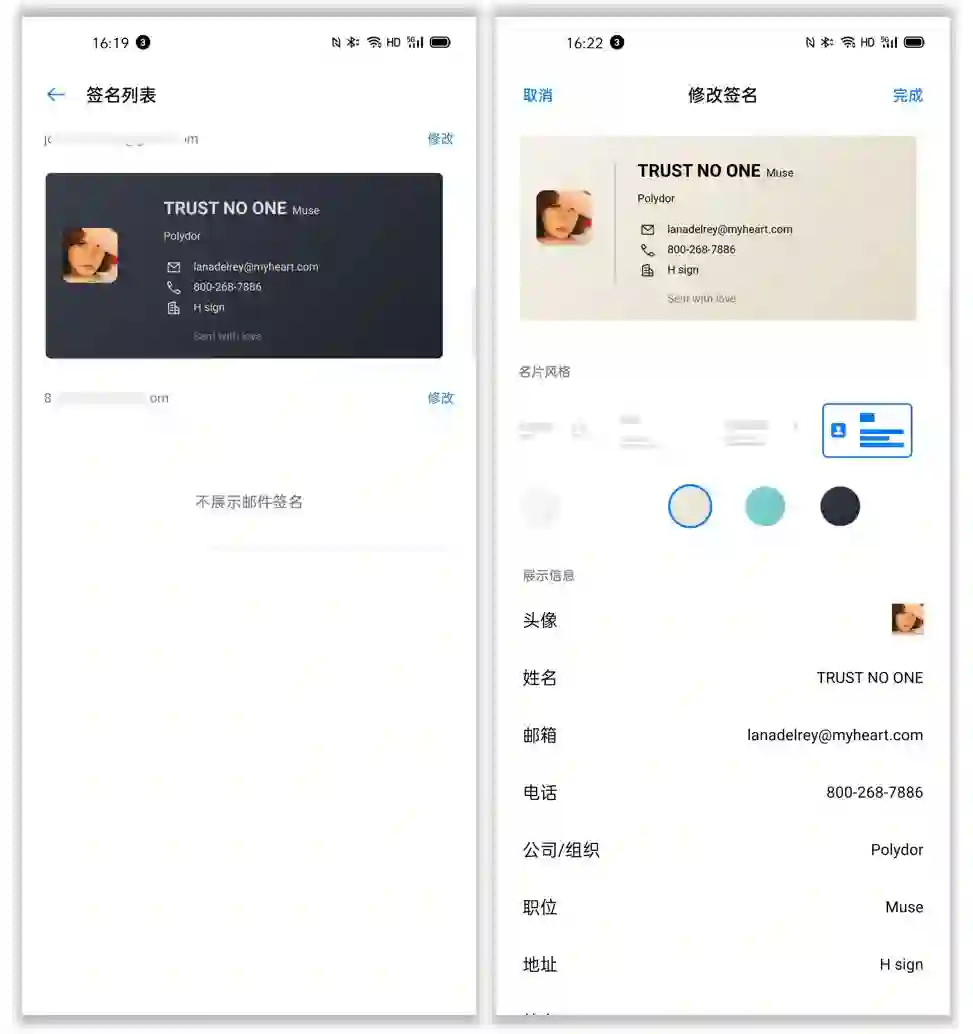 自定义邮件签名功能也是编辑部的心头好,毕竟邮件内容正儿八经,谁还不想在邮件签名里彰显一下个性呢?ColorOS 7.1 的邮件应用提供了四种邮件签名名片模板,每种模板都可以自定义色彩风格和展示信息。此外自定义邮件签名可针对不同的邮箱账号单独设置。