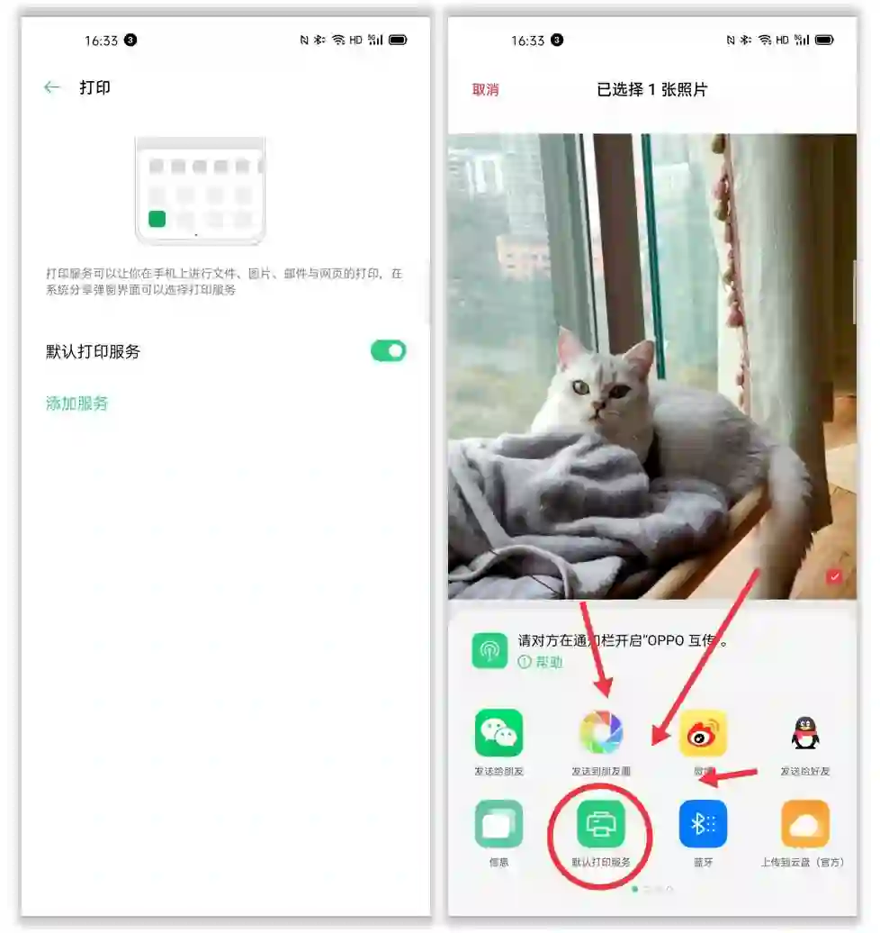 这还没完——除了浏览、编辑,我们有时也会遇到需要将手机里的文档进行打印的情况,这时 ColorOS 7.1 新增的无线打印功能就可以派上用场了:在「系统设置 > 其他无线连接 > 打印」中开启默认打印服务后,点击「分享」需要打印的 PDF 文档或照片,然后选择「默认打印服务」就能把它们「扔」给同一局域网内支持的打印机设备进行打印,打印前我们还可以直接在手机上调整页面、张数等等参数,是不是比找个 U 盘一顿拷贝然后在电脑上发送给打印机要方便很多?