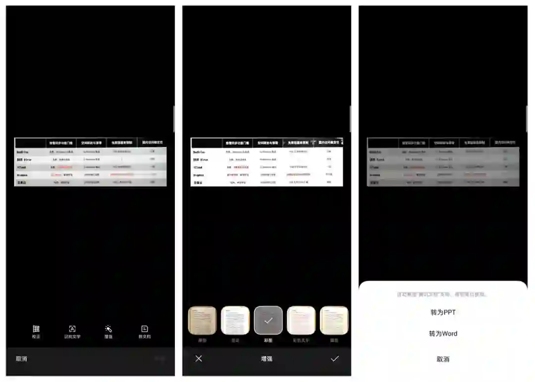 超级文本图片的编辑工具不仅支持手动校正边缘、识别提取画面中的文字内容,还提供了 7 种文本效果增强方式(提升文本和背景的对比度)并支持一键导出为 PPT 和 Word 文档——说是直接内置了一个 OCR 文本扫描工具都不过分。