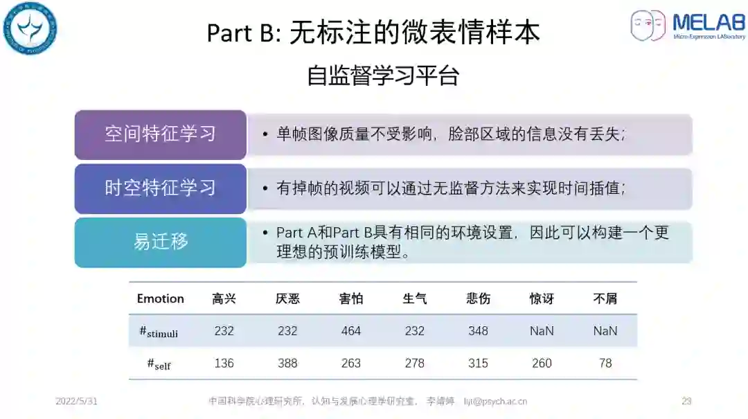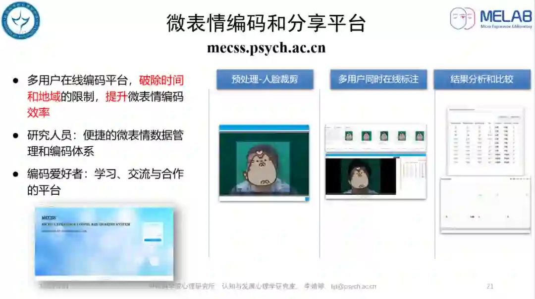 在Part A部分,李博士介绍了的微表情样本的采集环境和编码方式。特别是王甦菁博士创建的微表情编码与分享平台(Micro-expression coding and sharing system, MECSS),破除了微表情编码的时间空间和限制,为微表情编码提供了便捷。