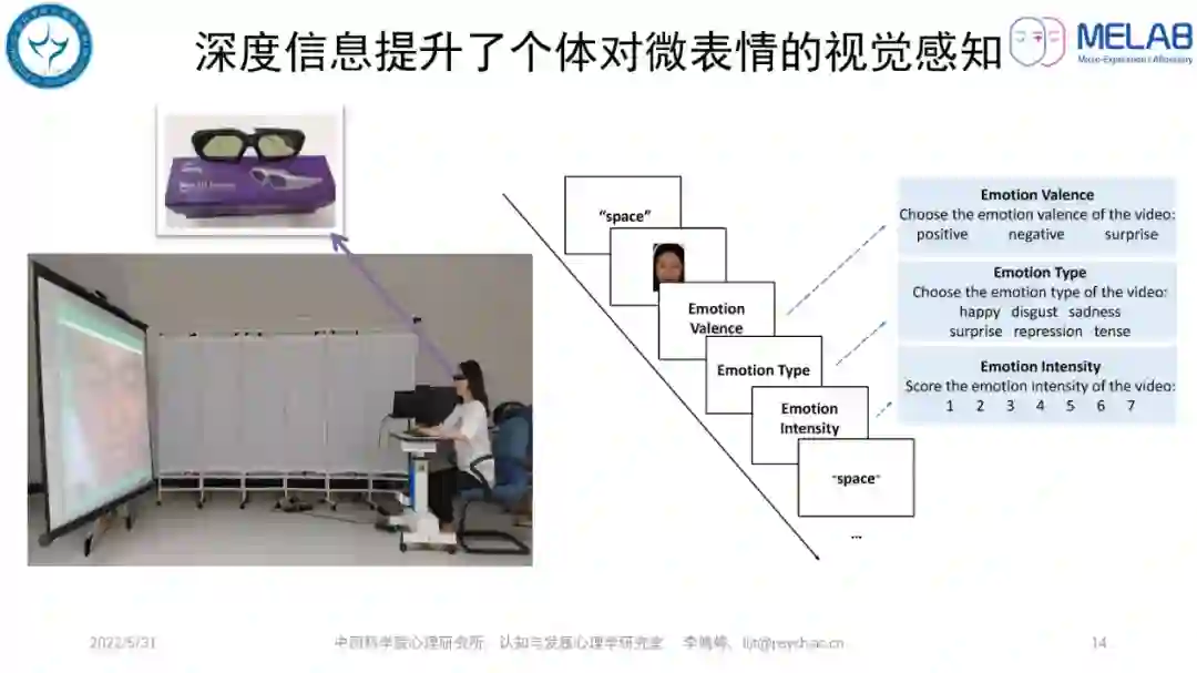 首先,CAS(ME)3的亮点之一是数据库中的样本包含深度信息。引入深度信息这一模态的灵感来自于基于人类视觉感知的微表情识别心理学实验。受试者被要求观看2D和3D微表情视频,并回答关于视频的情绪价值、情绪类型和情绪强度的三个问题。被试在观看3D视频的情况下,反应时间更短,强度评分更高,这表明深度信息可以促进个体对微表情的识别。