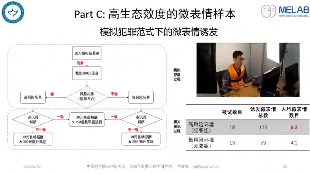CAS(ME)3的另一个亮点是它的高生态效度。在Part C中,李博士等人设计了模拟犯罪的诱发范式,使之微表情的诱发环境尽可能接近现实。并且,在数据采集的过程中,视频、语音和生理信号,包括皮肤电活动、心率/指尖脉搏、呼吸和脉搏,都由摄像机和可穿戴设备收集。实验表明,高风险场景(如犯罪)中的被试比低风险场景(如无罪)中的被试泄露更多的微表情。这种高生态效度的样本为现实世界中微表情分析和情绪理解提供了基础。