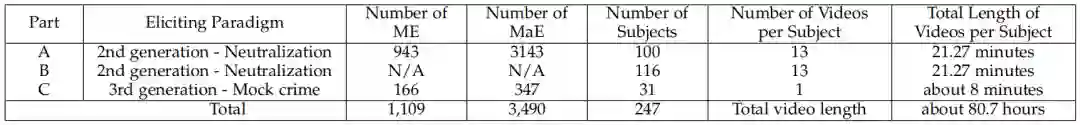 由于深度信息的变化可以为微表情分析提供更丰富的运动信息,在王甦菁博士的带领下,中国科学院行为科学院重点实验室微表情应用研究中心建立了CAS(ME)3数据库,这是一个大规模、自发的微表情数据库,包含了样本的深度信息,并且具有高生态效度。该数据库有望引领下一代微表情分析的发展。特别地,数据规模对于基于人工智能的微表情分析至关重要。CAS(ME)3提供了约80小时的视频,超过800万帧,包括1109个人工标注的微表情和3490个宏观表情。CAS(ME)3的大样本量可以有效地进行微表情分析方法验证,同时避免数据库偏差。