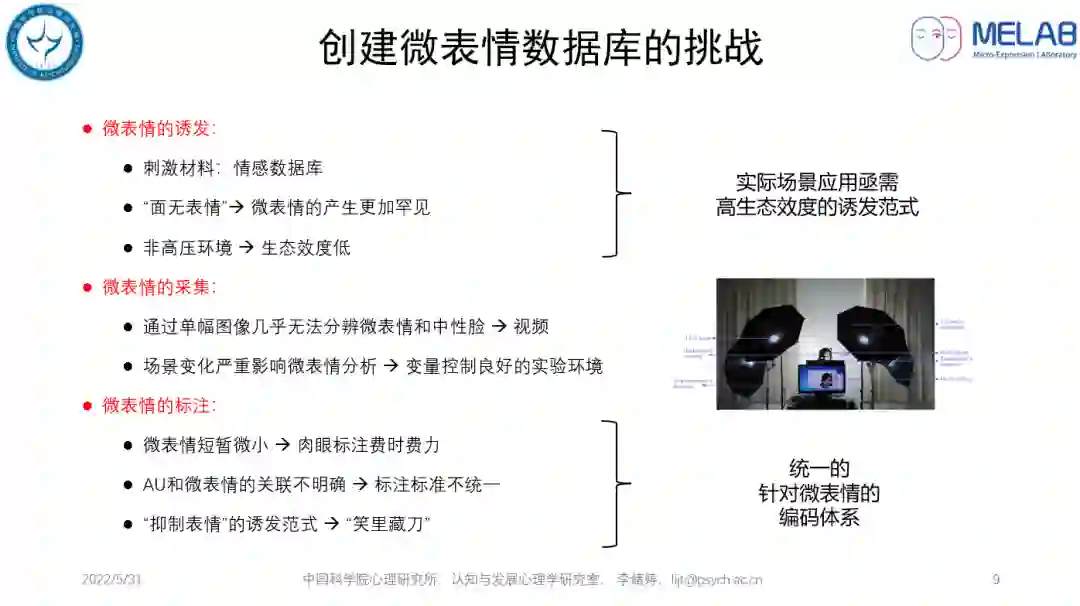 基于上述挑战,李婧婷博士首先分别从微表情的诱发、采集和标注三个方面介绍了创建微表情数据库的挑战。