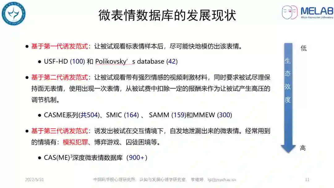 然后,根据从低到高的生态效度,李博士分别介绍了第一代模仿表情数据库,第二代基于“面无表情”诱发范式的自发微表情数据库和第三代的较高生态效度的微表情数据库。
