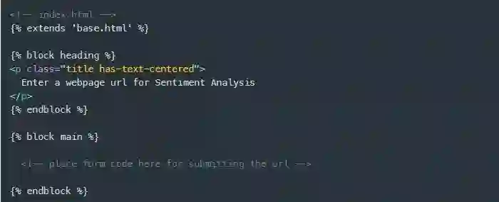 接下来,我将构建index.html模板,首先从扩展base.html模板开始,使用extends模板上下文帮助器跟着用引号括起来的base.html文件的名称来完成。然后,我为标题和主区块提供了一个实现。现在标题就包含一个段落元素,主块包含一个占位符注释,稍后我将在其中添加一个表单和一个用于收集网页url的输入字段,以及一个提交按钮。