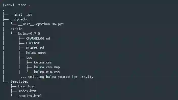 显然这并不令人兴奋,所以我将继续。接下来,我将在sentializer包中添加两个新的目录。一个目录名为templates,用于存放Jinja HTML模板。另一个目录名为static,它包含一个名为Bulma的CSS框架,用于去掉单调的HTML外观。下面是tree命令的输出,所以你可以看到我在做什么。