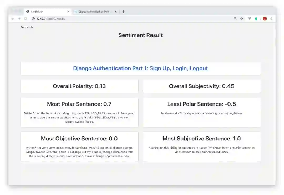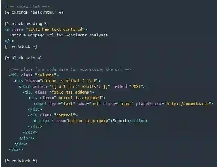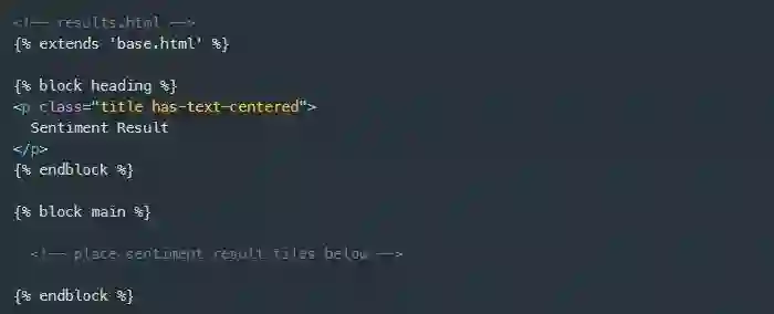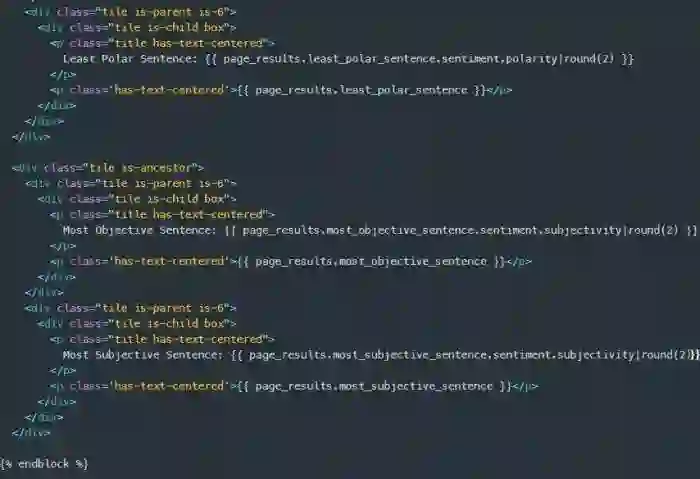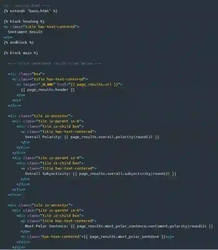 我对results.html模板做了类似的处理,它最终将显示一系列块,每个块都包含一个计算出的情感值,用于提交的url页面的文本分析输出。