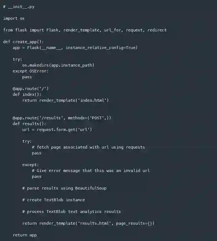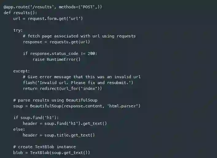 新引入的results()视图函数需要一个名为url的表单字段,它可以由我之前从flask包中导入的全局请求对象上的表单字典字段进行检索。我还添加了一些注释来描述执行文本分析所需的程序流,然后再次使用了render_template函数,但是使用了一个新的关键字参数page_results,目前它只是一个空字典。