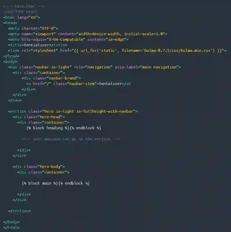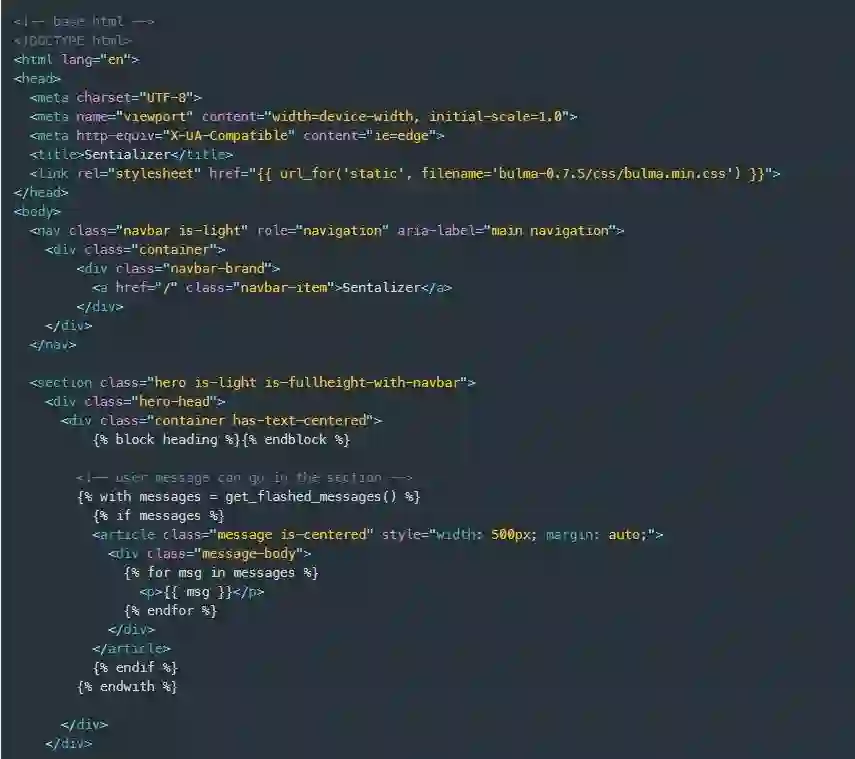 我首先构建base.html模板,它是另外两个页面的主布局。这个base.html模板引用了bulma css的源代码,并创建了一个导航条,其中包含一个指向主页路径的logo链接。此外,我使用{% block %}语法定义了两个Jinja代码块部分。这些代码块用于通过index.html和results.html模板来将标题和主要内容注入其中,这些模板将扩展base.html。