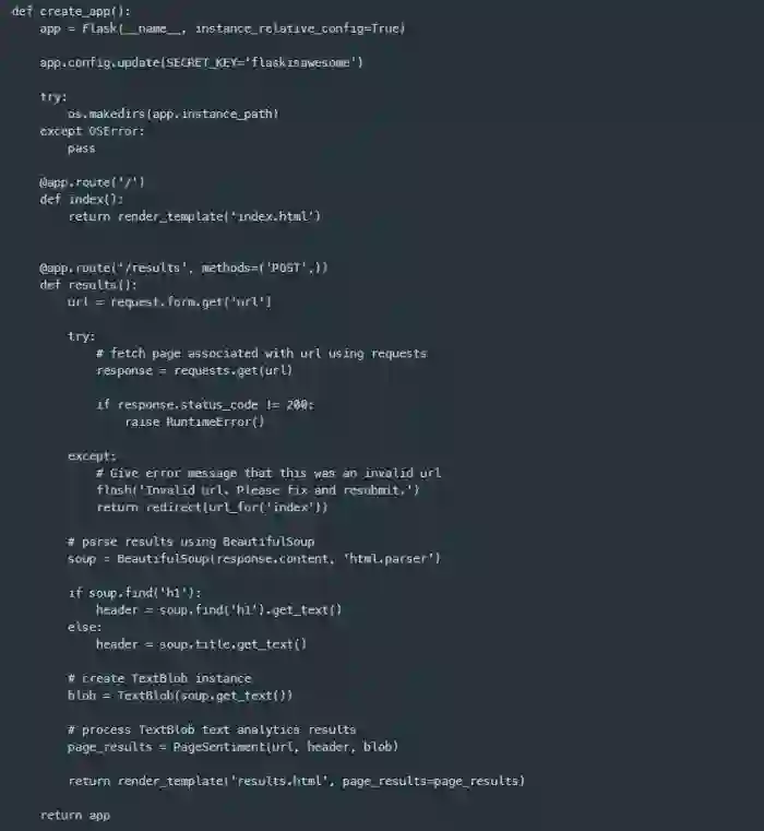 本文介绍了如何构建一个基于Python和Flask的web应用程序,用于在互联网资源(比如博客页面)上执行文本分析。为了执行文本分析,我将使用Requests获取web页面,使用BeautifulSoup解析html和提取可视文本,并应用TextBlob包来计算一些情感得分。本文的代码托管在GitHub上,所以请复刻并使用它进行试验。