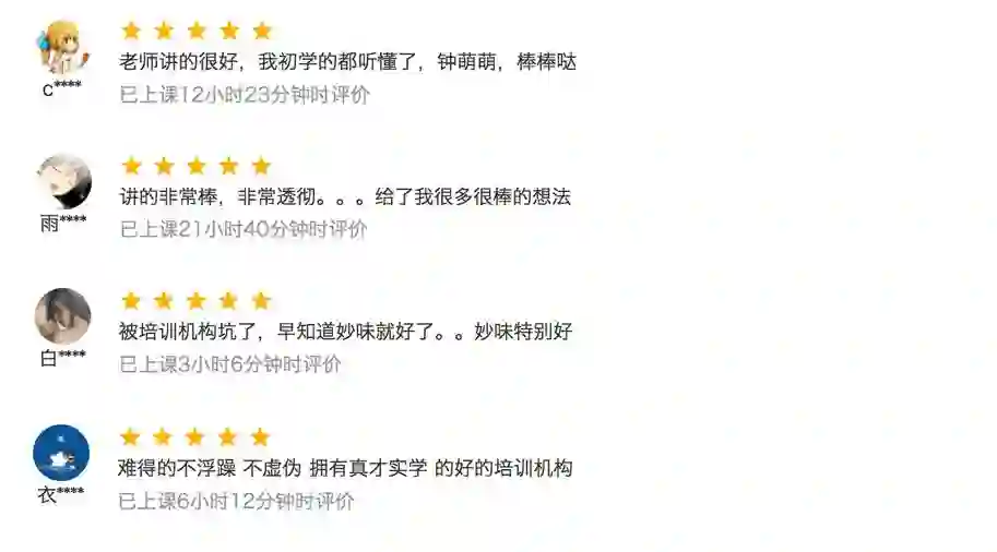 导师经验丰富:团队均来自大厂,风趣幽默,透彻深入,小白也能听得懂;