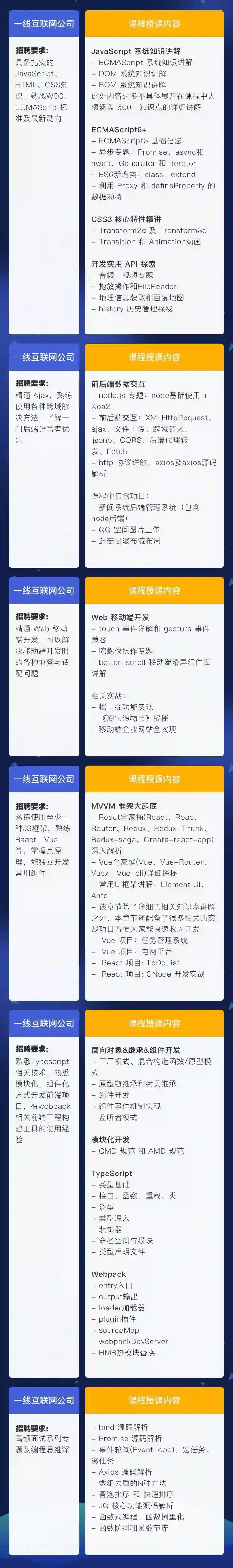 结课标准高:四个月的学习时间,充分夯实基础,最终以开发出基于vue和react的工程级项目为结课标准,保你成长为技术过硬的Web前端高级工程师。