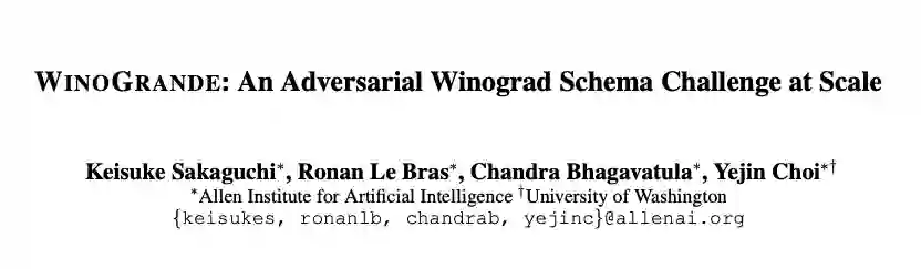 论文:WinoGrande: An Adversarial Winograd Schema Challenge at Scale论文地址:https://arxiv.org/abs/1907.10641 The Winograd Schema Challenge (WSC) 是一个人类常识推理的基准,其本身包含由273个专家设计的问题,这些问题无法用选择偏好或者单词关联的统计模型解决。最近的一些神经语言模型方面的工作已经在WSC以及相关的基准测试中达到了90%的准确率。但是这些模型是否稳健?是否高估了机器常识的真实能力?为了研究此类问题,作者引入了WinoGrande测试集,一个包含44000个问题的大规模数据集。受最初的WSC设计的启发,为了提高数据集的效率,进行了调整。数据集调整的关键步骤包括:1.精心设计的众包问题;2.使用AFLITE 算法减少系统偏差,该算法可以将自然语言转化为机器可以处理的向量。WinoGrande上最好的方法达到59.4-79.1%的准确率,比人类的94.0%低15-35%,当然,这也取决于允许的训练数据量。此外,作者也在WSC(90.1%)、DPR(93.1%)、COPA(90.6%)、KnowRef(85.6%)和Wingender(97.1%)这五个相关基准上进行了新的测试。测试结果表明:1、WinoGrande作为迁移学习资源是有效的;2、我们高估了基准测试中机器常识的真实能力。