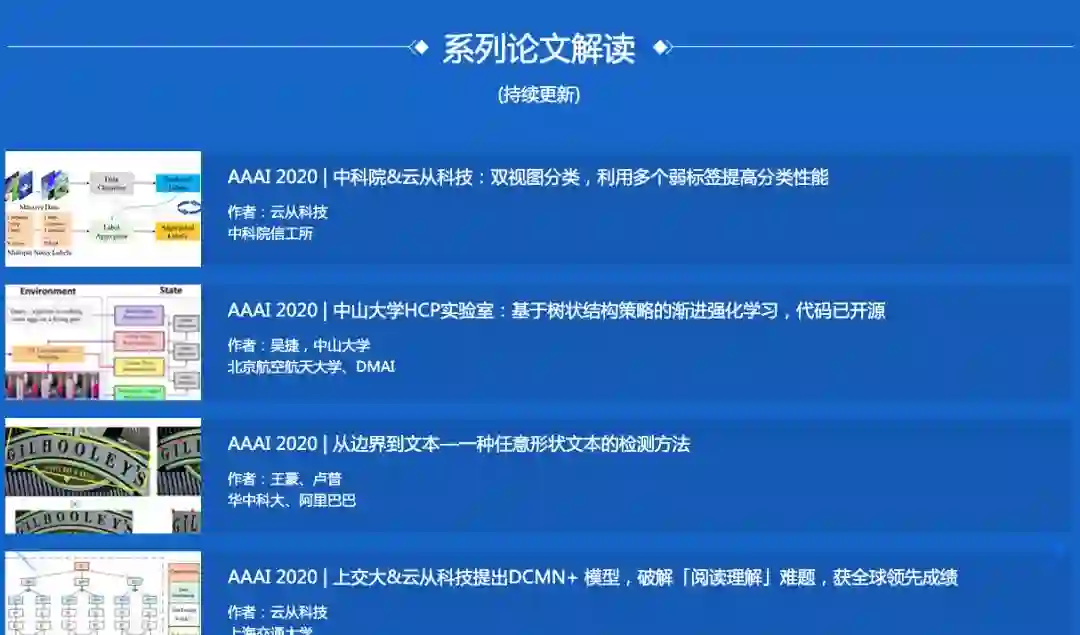 除了最佳论文奖之外,AAAI 2020 还颁发了蓝天创意奖(AAAI-20 Blue Sky Idea Awards),一共三篇。 第一篇论文:Back to the Future for Dialogue Research作者:Philip r. Cohen所属机构:蒙纳士大学论文地址:https://arxiv.org/pdf/1812.01144.pdf第二篇论文:AI for Explaining Decisions in Multi-Agent Environments作者:Sarit Kraus,1 Amos Azaria,2 Jelena Fiosina,3 Maike Greve,4 Noam Hazon,2 Lutz Kolbe,4 Tim-Benjamin Lembcke,4 Jorg P. M ¨ uller, ¨ 3 Soren Schleibaum, ¨ 3 Mark Vollrath5所属机构:巴依兰大学、艾瑞尔大学(以色列),克劳斯塔尔工业大学、哥廷根大学、布伦瑞克工业大学(德国)论文地址:https://arxiv.org/pdf/1910.04404.pdf第三篇论文:Unveiling Hidden Intentions作者:Gerardo Ocampo Diaz, Vincent Ng