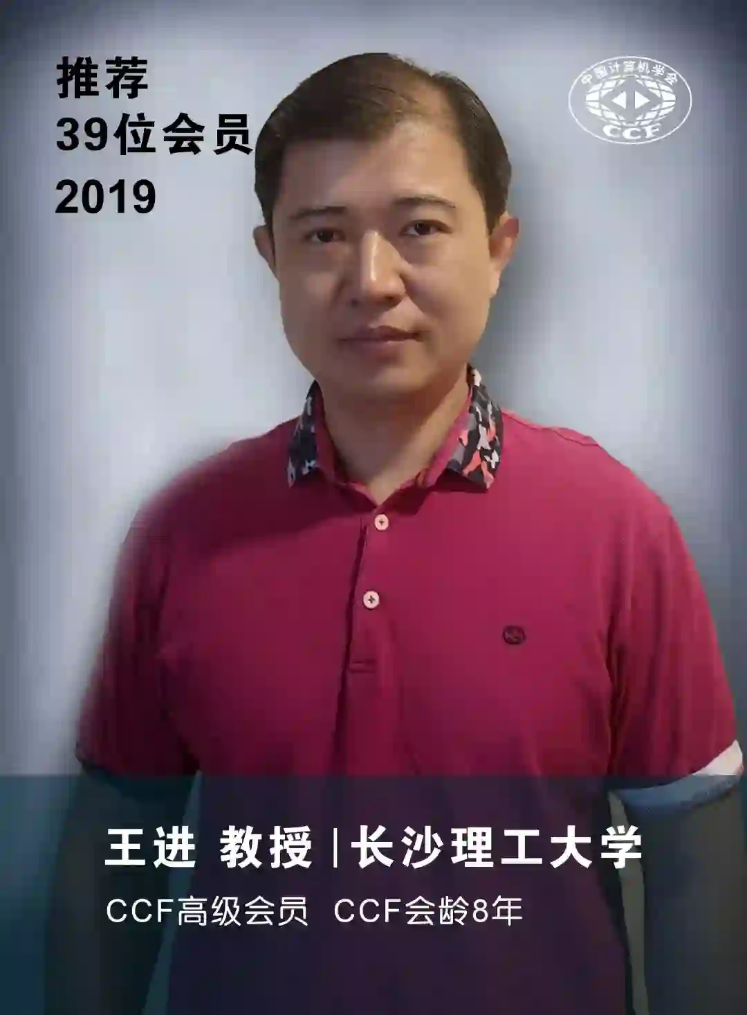 CCF高级会员、长沙理工大学王进教授,2011年12月加入CCF,2019年以来累计推荐会员总数达39位。当被问及为何积极推荐身边计算机领域专业人士加入CCF时,他说: