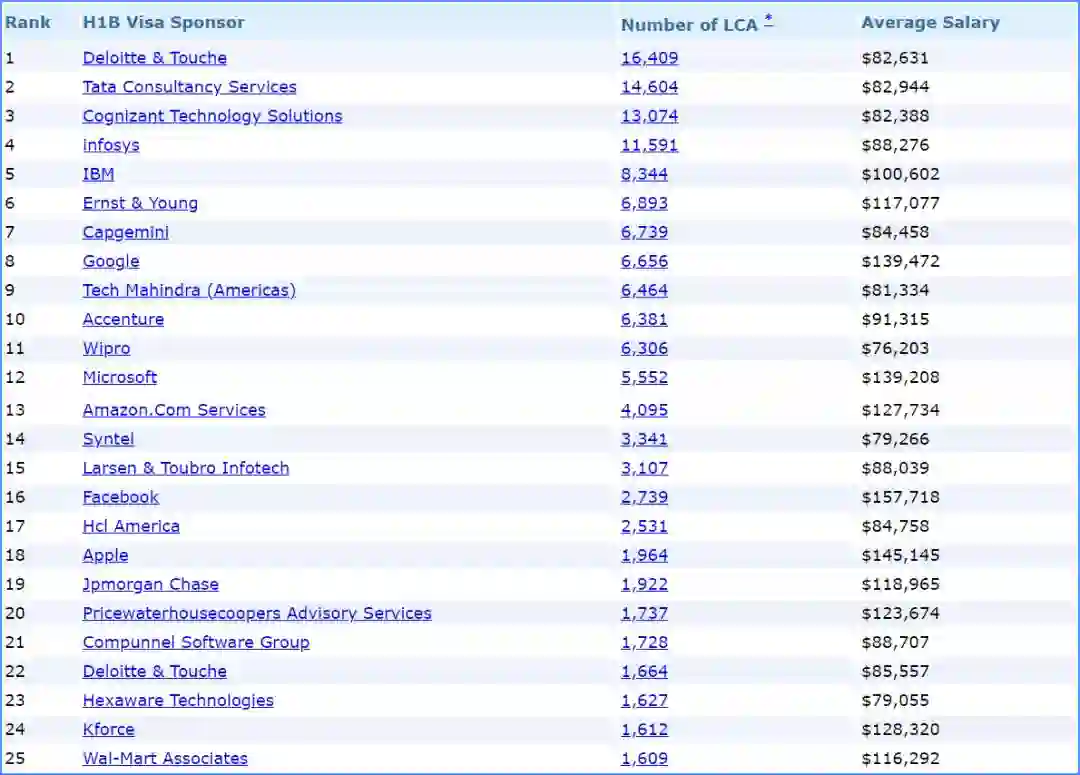 从2016财年到2018财年,塔塔咨询服务有限公司累计提交了41274份关于H1B签证的劳动条件申请和1365份绿卡劳工证明,在所有签证赞助商中排名第2(2018财年以14604份申请排名第2)。
