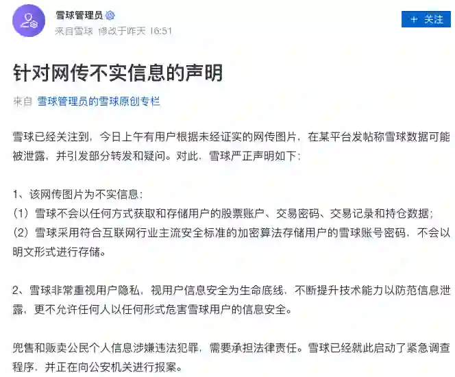 雪球发文称,该网传图片为不实信息;兜售和贩卖公民个人信息涉嫌违法犯罪,已经就此启动了紧急调查程序,并正在向公安机关进行报案。雪球网还称,会持续提升对用户信息的保护能力。(快科技)