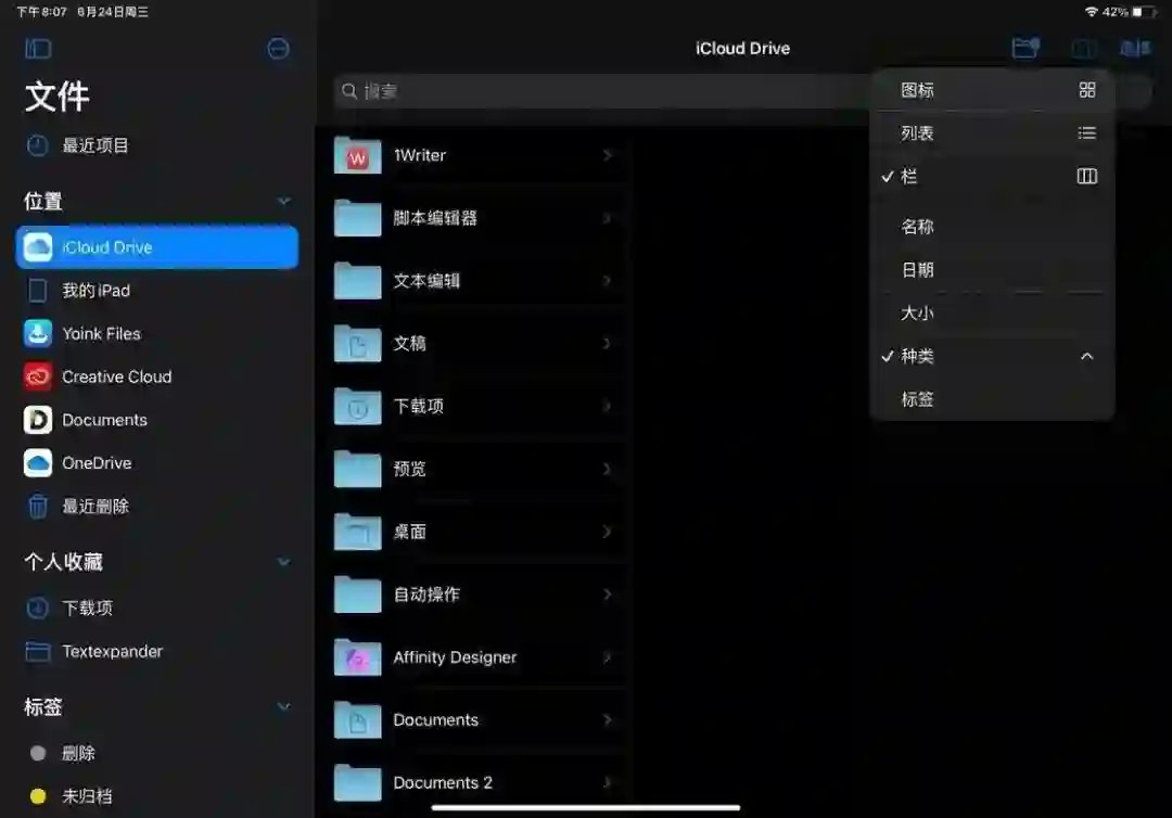 另外,iPadOS 14 还对原生 app 的工具栏进行了简化,并采用统一设计的下拉菜单。例如,在文件 app 中,视图和排序方式等在 iPadOS 14 中都被集成在右上角的下拉菜单中,不再单独显示在界面内。