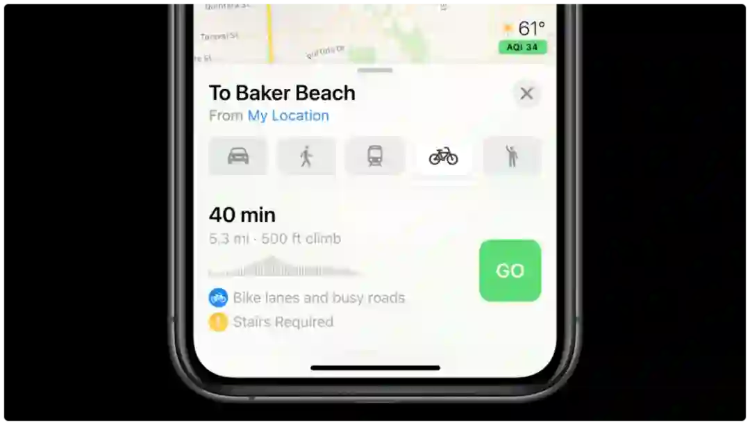 地图 app 新增骑行模式,规划路线时会考虑海拔因素,帮你避开陡坡、楼梯等路线。骑行地图将从美国的部分城市开始支持,国内将会从北京和上海开始支持,后续会增加其他城市。