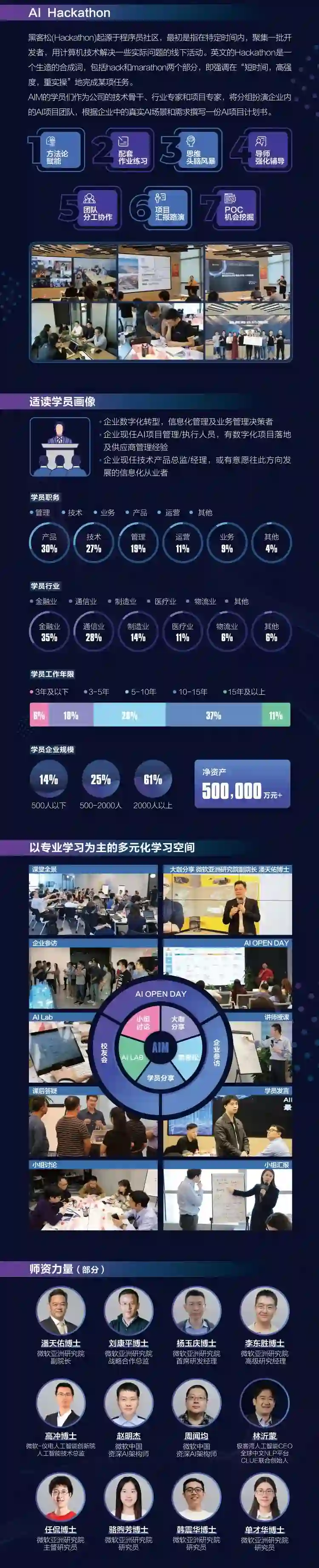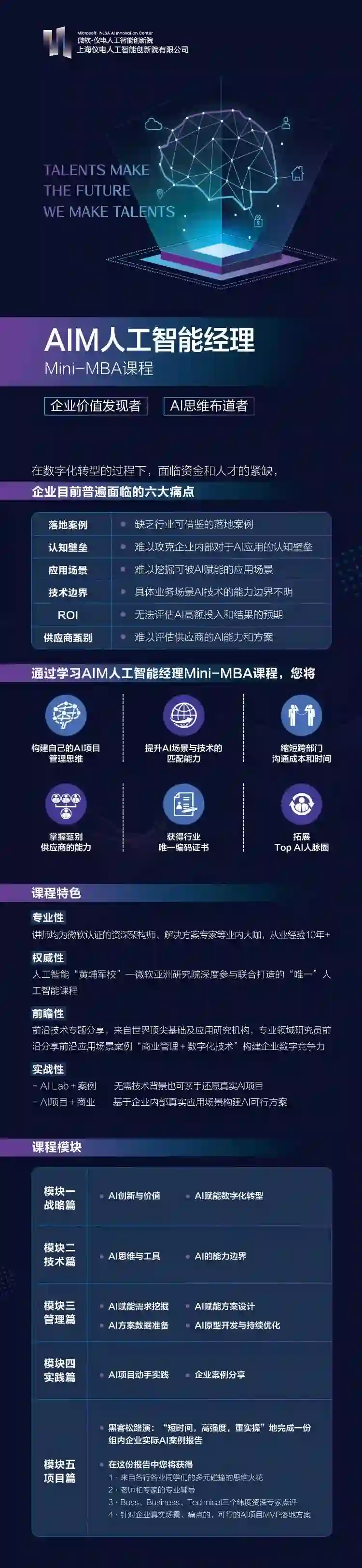 微软亚洲研究院和微软-仪电人工智能创新院共同打造的 AIM(人工智能经理课程)根据这种“AI+PM+BIZ”的复合型能力培养模式进行了课程升级迭代,结合 AI 思维中的技术、产品、企业三大纬度,构建出了一套由技术创造产品,产品带动企业升级的 AI 思维能力新方向,赋能学员在商业价值挖掘、AI 技术选择、可行性分析到项目落地实现的“顶配”版 AI 项目管理能力!