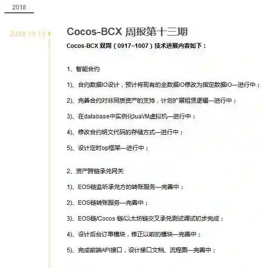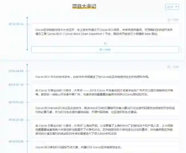 依据项目官方网站信息披露,大事记显示2018年第三季度Cocos-BCX主链已经启动了内测。基于项目技术模块的明显特征,Cocos-BCX推出了系统级和功能性两大系列产品,其中包含多种操作与多环境的开发框架、铁匠铺机制等。