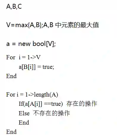 static void ValidateArrayElement(){Stopwatch sp = new Stopwatch();sp.Start();Random rand = new Random();Int32 maxValue = 120000;//元素最大值,是一个假定值Int32 length = 70000;// A,B的长度Int32[] A = new Int32[length];Int32[] B = new Int32[length];Boolean[] C = new Boolean[length];Boolean[] Atemp = new Boolean[maxValue];//临时的辅助变量//随机初始化A,B数组for (int i = 0; i < length; i++){A[i] = rand.Next(maxValue);B[i] = rand.Next(maxValue);}//循环B,验证元素是否存在foreach (var item in B) Atemp[item] = true;//循环A,验证是否存在,将C对应位置标记为truefor (int i = 0; i < A.Length; i++) if (Atemp[A[i]]) C[i] = true;sp.Stop();//停止计时Console.WriteLine(sp.ElapsedMilliseconds);}