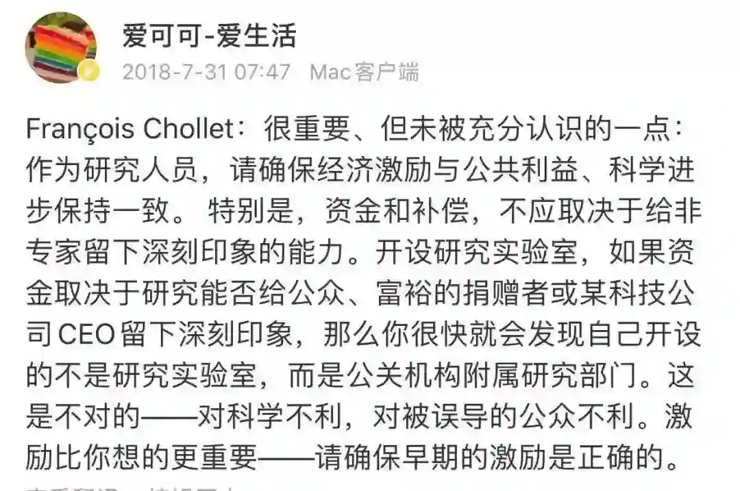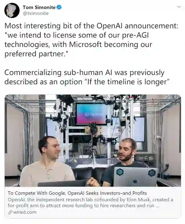 资金的压力迫使OpenAI渐渐违背了其最初的保证。但不可否认的是 OpenAI 仍然是一个人才和前沿研究的堡垒,充满了真诚地为人类利益而努力工作的人们。换句话说,它的初心仍未变,仍然有时间去纠偏匡正。而另一方面,正是由于他们在尝试进入一个未知的领域,所以才会有各种各样的错误出现。作为旁观者,我们应该为他们提供正确的批评。谁会希望,在未来AGI是由像Google、亚马逊、Facebook、苹果或阿里巴巴这样的企业开发出来,而非OpenAI这样的非营利性组织呢?但放弃控制才是理想的开源的逻辑本质。倘若真的集齐足够多的最强大脑来共同完成AGI目标,打败凭借个人私力控制人工智能世界的恶念最好的方式是让每个人都拥有这项技术。针对这个问题,马斯克也非常关心,其在twitter上表示:OpenAI应该更多的开放。但是坚持初衷,完全开放对于一家只是实验室的OpenAI来说是最好的选择么?或许正如微博大V“爱可可-爱生活”引用François Chollet一段话那样吧:相比初衷,是否有持续正确的激励,真正决定了实验室将走向何方、能走多远。参考:[1] The messy, secretive reality behind OpenAI’s bid to save the world, https://www.technologyreview.com/s/615181/ai-openai-moonshot-elon-musk-sam-altman-greg-brockman-messy-secretive-reality/[2] 拿了微软 10 亿美元的 OpenAI,到底想做什么?,https://baike.baidu.com/tashuo/browse/content?id=df6178d6a398cbbcb21dc4ad&lemmaId=19758408&fromLemmaModule=pcRight