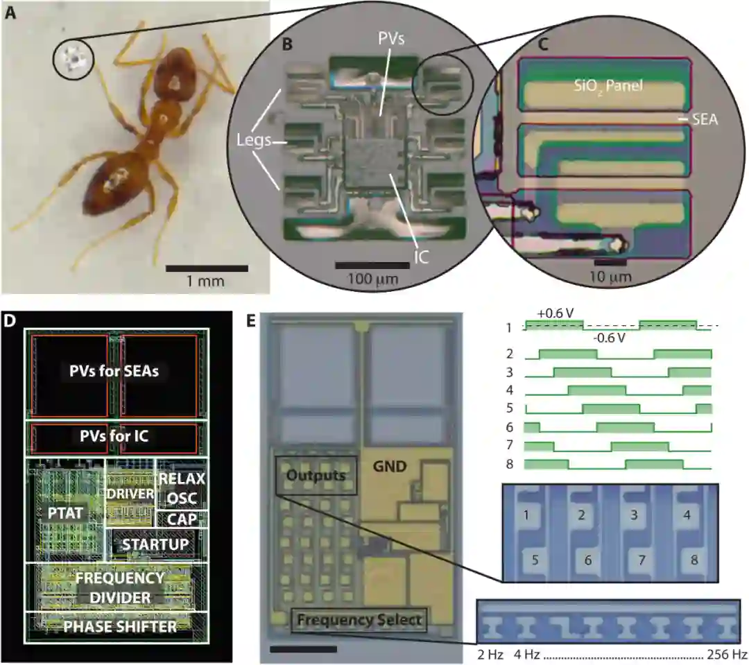 (A) 微型机器人和蚂蚁的体型对比。(B)机器人的放大视图。该机器人由三个主要部分组成:用于控制机器人的 IC,让机器人行走的腿以及用于为腿和电路供电的 PV。(C)机器人一条腿的放大图像。它由 SiO2 和 SEA 的刚性面板、提供运动的活动铰链组成。(D)带有标记的主要电路块的电路的 CAD 布局图像。(E)微型机器人控制电路的光学显微镜图像。比例尺,20 μm。该电路有八个输出,可提供电压幅度约为 0.6 V 的相移方波。这些方波的频率可以通过硬接线电路的「频率选择」来设置。PTAT,与绝对温度成正比。