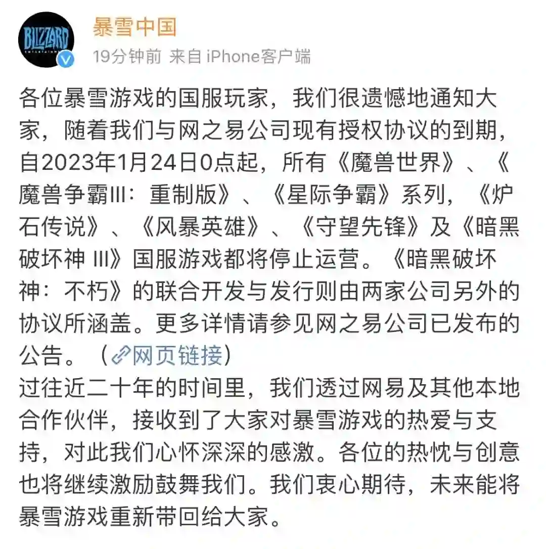 暴雪娱乐发布声明称,同网易的现有授权协议将在2023年1月23日到期,将暂停在中国大陆的大部分暴雪游戏服务,包括《魔兽世界》《炉石传说》《守望先锋》《星际争霸》《魔兽争霸III:重置版》《暗黑破坏神III》和《风暴英雄》。