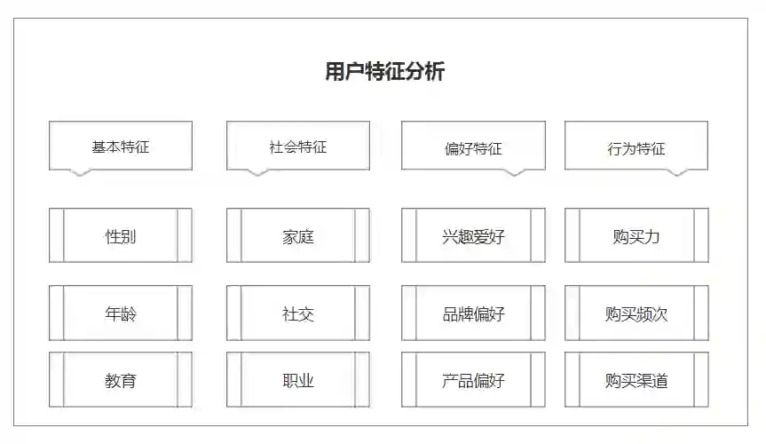 用户画像包含的内容并不完全固定,不同企业对于用户画像有着不同对理解和需求。根据行业和产品的不同,所关注的特征也有不同,但主要还是体现在基本特征、社会特征、偏好特征、行为特征等。