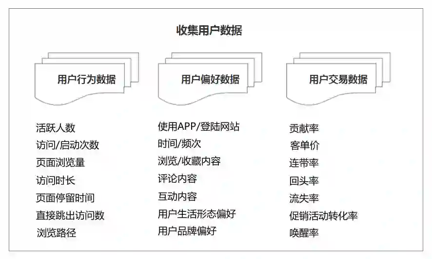 数据收集主要包括用户行为数据、用户偏好数据、用户交易数据。