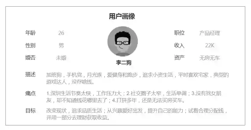 以李二狗的户画像为例,我们将其年龄、性别、婚否、职位、收入、资产标签化,通过场景描述,挖掘用户痛点,从而了解用户动机。其中将21~30岁最为一个年龄段,薪资20~25K作为一个收入范围,利用数据分析得到数据标签结果,最终满足业务需求,从而让构建用户画像形成一个闭环。