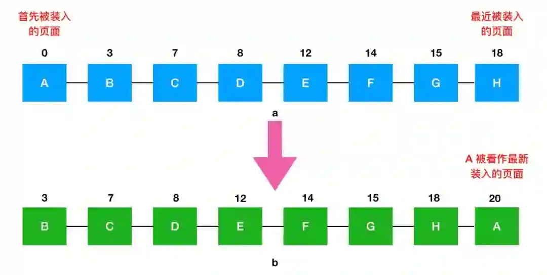 先进先出页面可能是最简单的页面替换算法了。在这种算法中,操作系统会跟踪链表中内存中的所有页。下面我们举个例子看一下(这个算法我刚开始看的时候有点懵逼,后来才看懂,我还是很菜)。
